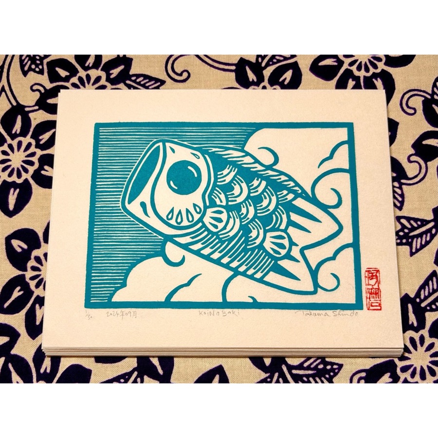 Lino-gravure "KoinoburiI " de la série sur la culture japonaise chère à Takuma Shindo .