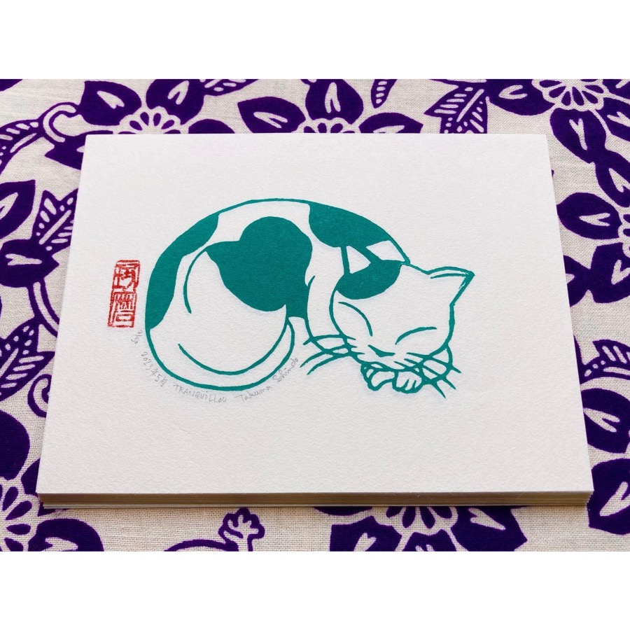 Lino-gravure "Nya" de la série chat "UBU" qui a accompagné l'artiste plus de 20 ans et qui lui donné l'inspiration pour sa série sur les chats.