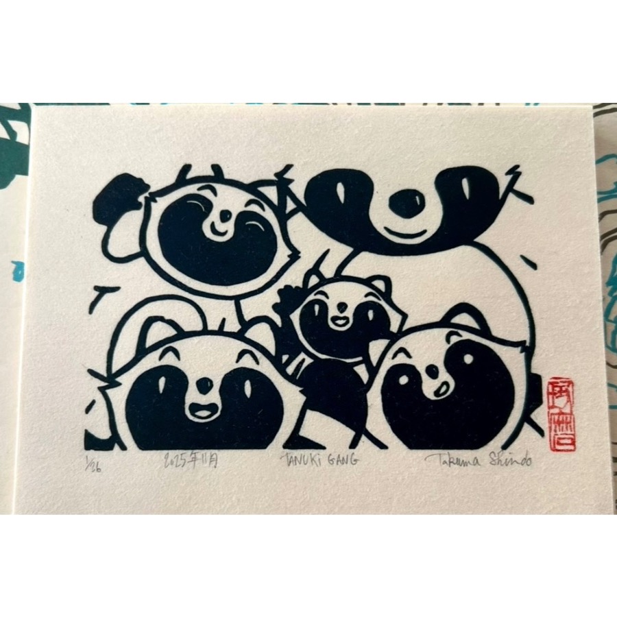 Lino-gravure "Tanuki Gang" de la série "TANUKI" .