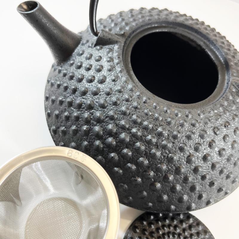 Cette théière en fonte du Japon, modèle Hira-arare, d'un noir mat est dotée d'un filtre amovible en acier inoxydable et dispose d'un intérieur émaillé en 3 couches, ainsi qu'une anse en aluminium de couleur noire.