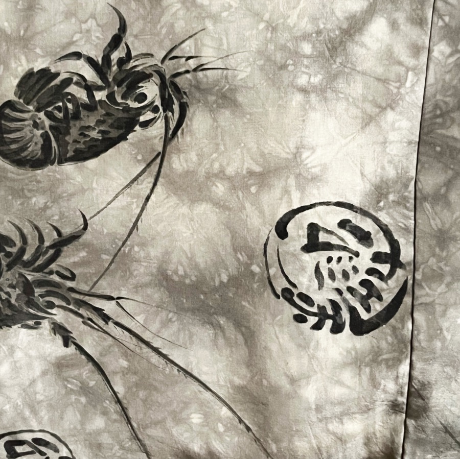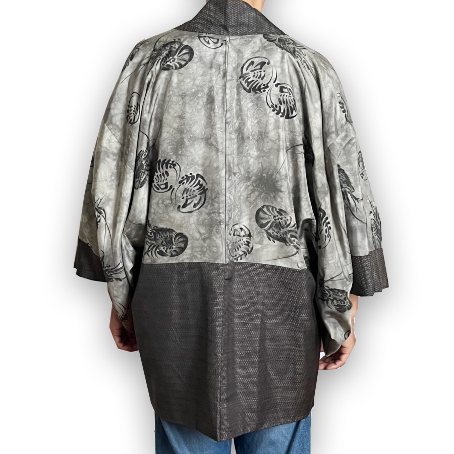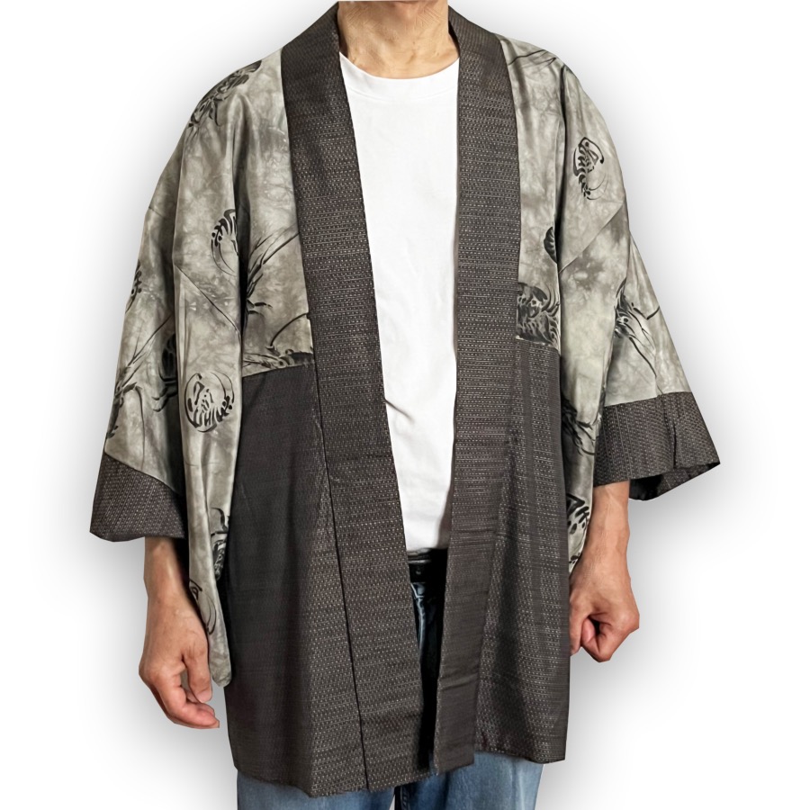 Belle veste traditionnelle japonaise, haori masculin en soie assez légère marron clair . Belle doublure en soie brillante ornée de langoustes.