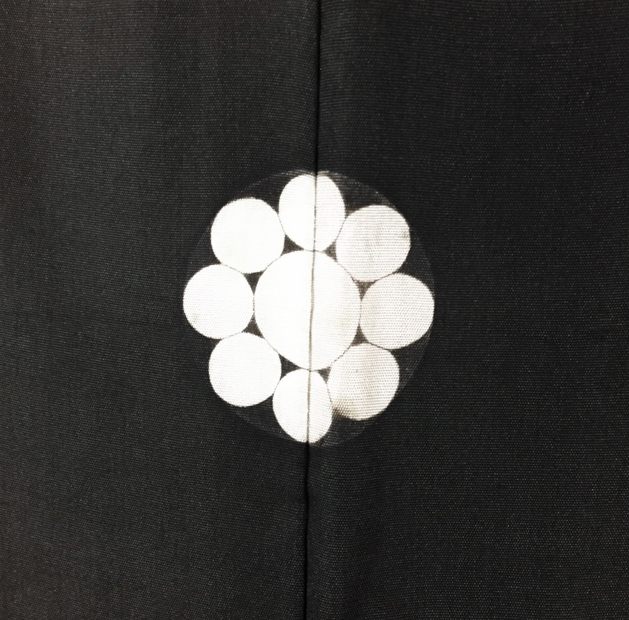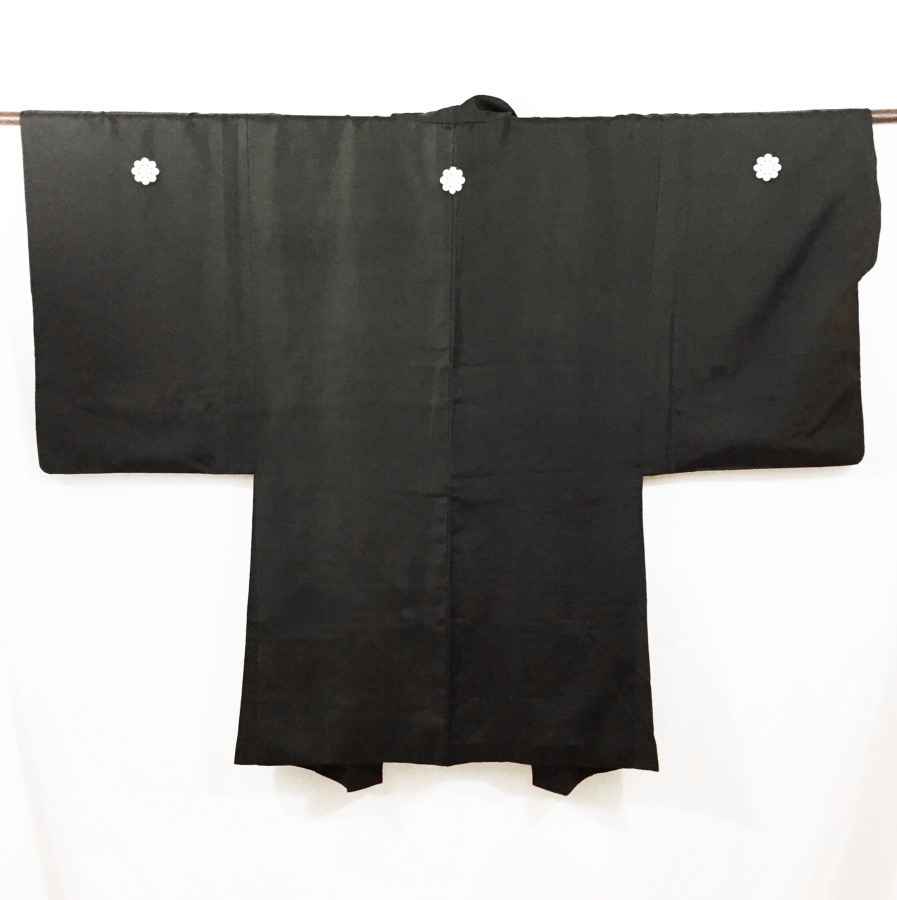 Belle veste traditionnelle japonaise de cérémonie, haori masculin en soie souple et légère noire ornée d'un emblème familial dans le milieu du dos et sur les manches.